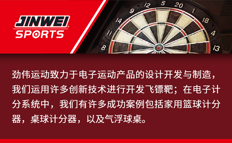勁偉運動致力于電子運動產品的設計開發與制造,我們運用許多創新技術進行開發飛鏢靶;在電子計分系統中,我們有許多成功案例包括家用籃球計分器,桌球計分器,以及氣浮球桌。